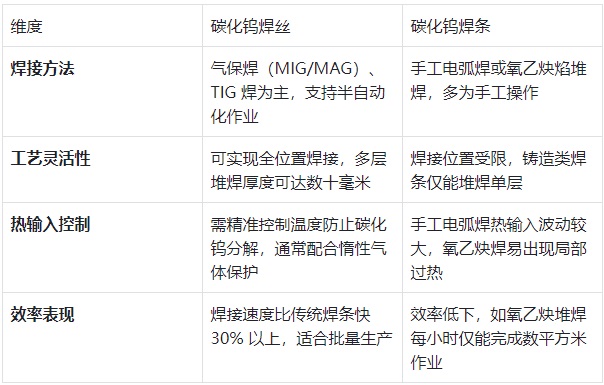 碳化钨焊丝与焊条虽同属耐磨堆焊材料,但其物理形态、成分分布和焊接逻辑存在根本性不同,直接决定了二者的工艺适配性与性能边界。