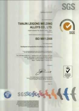 在天津雷公焊接材料有限公司董事会的部署下,在各部门通力合作下,全公司员工在经历了艰苦的认证前期准备、体系策划和评估、体系总体策划和设计、审核前准备、审核和取得证书等阶段,终于顺利地通过了ISO9001质量体系认证,于2014年2月获颁国际知名的SGS认证证书和UKAS证书(英国皇家认可委员会)。