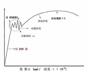 有些 钢材(如 高碳钢)无明显的屈服现象,通常以发生微量的塑性变形(0.2%)时的应力作为该钢材的屈服强度,称为条件屈服强度(yield strength)。